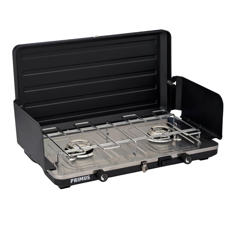 The Primus MOTO Stove is a two-burner gas stove designed for simple outdoor cooking.